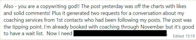 Your book is on its way to your inbox right now.Look for an email titled “Your Social Copywriting Bible book” from [email protected].Make sure you find it and open it or you won’t see the book and any future goodies from me. It should be there within 5 minutes so check your spam and promotions if you don’t see it.You've just taken the first step toward mastering social media copywriting and turning your social media profile into a lead and client-generating machine.But if you’re serious about getting results today, then I have a question for you…