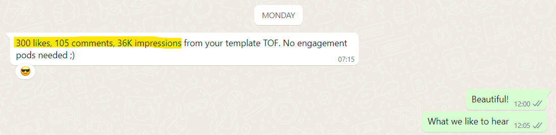 👉 A career coach generated 36,000 impressions and 300 likes from one TOFU template post: